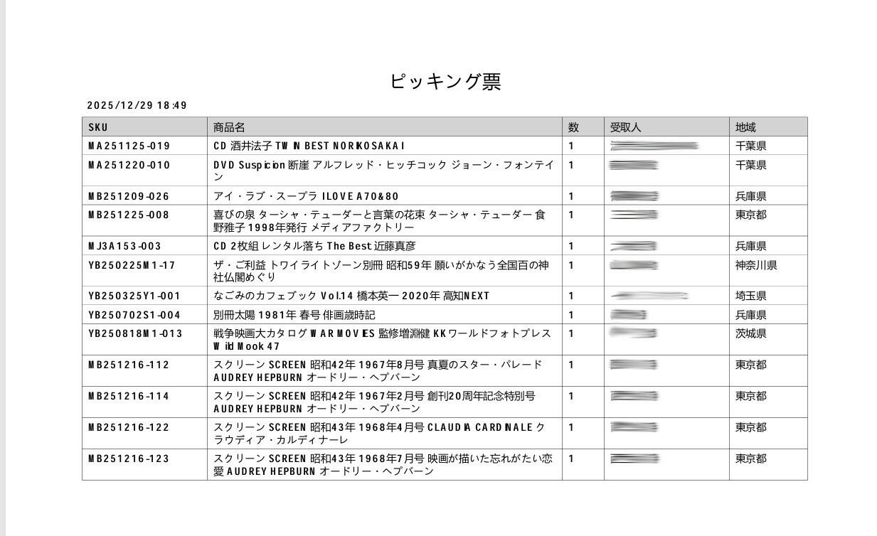 ・ピッキング票(SKU順/受注順に並べ替え可能)